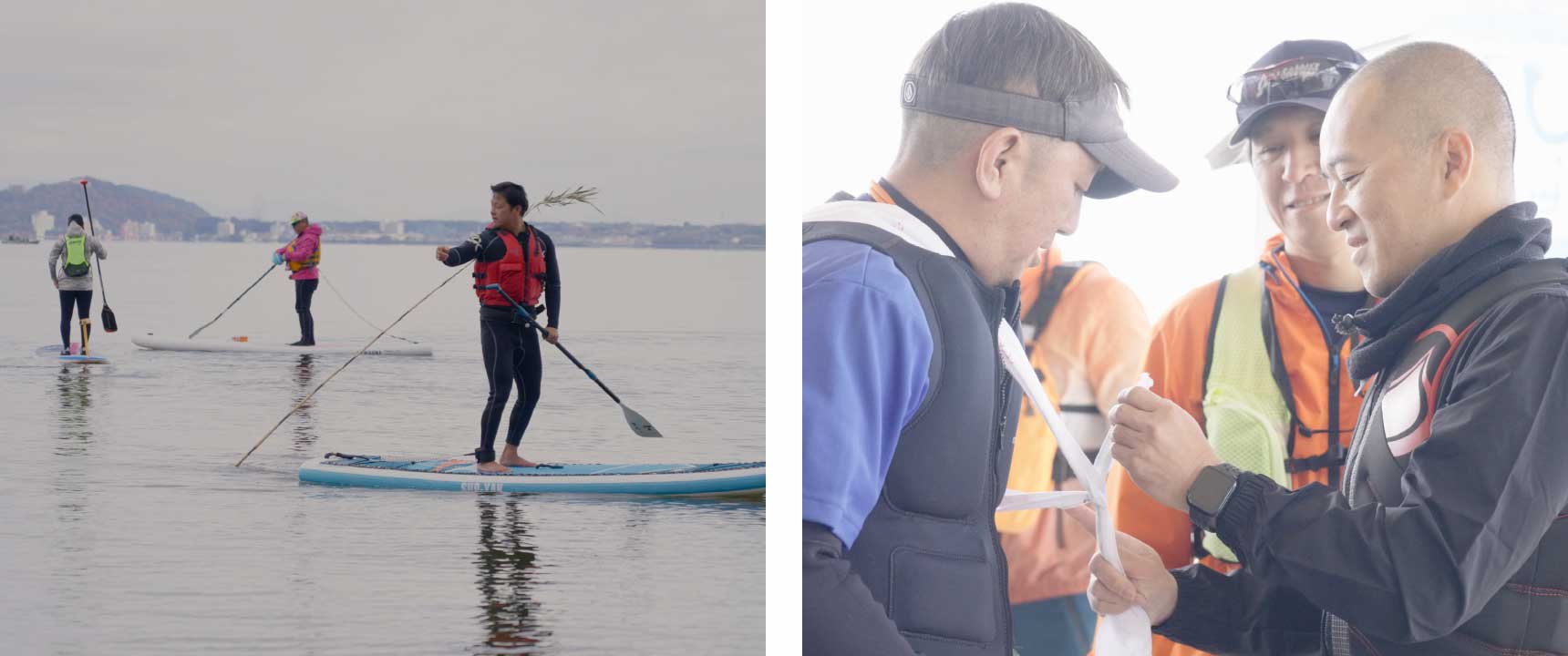 - SUPでリレーする「たすき」には急減したアマモ場再⽣への思いを書き⾜していきます。