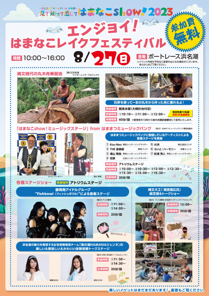 8/27(日)に湖西市にあるボートレース浜名湖を会場に開催される、「エンジョイ!はまなこレイクフェスティバル」。はままつミュージックバンクのアーティストによる音楽ステージや、海の湖HAMANAジェンヌとテレしずアナウンサーによる楽しいトークショー、また静岡発アイドルグループfishbowlの歌唱ステージなどが無料で楽しめる、とってもお得な夏休みイベントです!